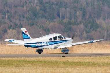 Wangen-Lachen, İsviçre, 27 Mart 2022 Piper PA28-181 Archer II pervane uçağı küçük bir havaalanından kalkıyor.