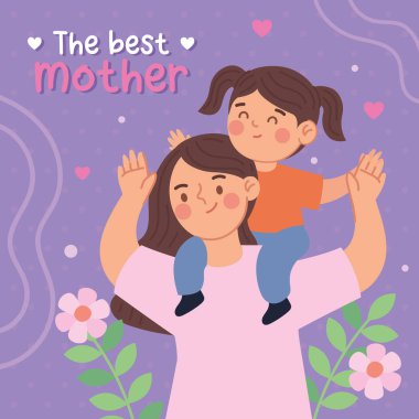 Anneler Günü 'nde evde annelerine sarılan sevimli çocukların el çizimi. Sıcak aşk kavramı.