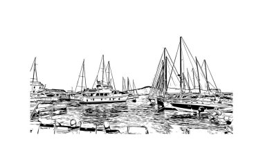 Print Building view with landmark of Monaco is the country of Europe. Vektörde elle çizilmiş resim ile suluboya sıçraması.