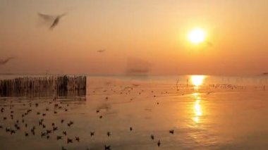 Büyük nehirde yükselen altın gün doğumu video çerçevesinin sağ tarafında bir sürü büyük balık tuzağı ağı var.