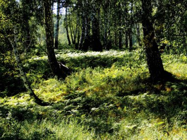 Yeşil ormanda bir yol var. Ağaçların arasından gün ışığı. İlkbahar, yazın başı. Çevre koruma, ekoloji, saf doğa, eko turizm. Idyllic manzara