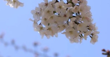 Kiraz ağacında beyaz kiraz çiçekleri. Yaklaş. Kiraz çiçeğinin beyaz taç yaprakları. Doğa. Doğal ışıklandırmalı parlak çiçek sahnesi. Bahar konsepti
