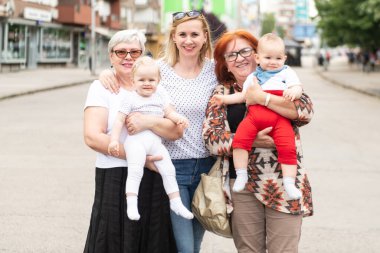 İki beyaz kadın ellerinde bebekle sokakta yürüyorlar.