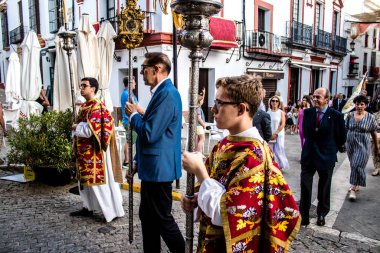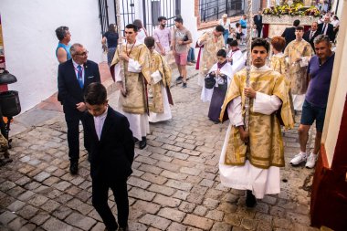 Carmona, İspanya - 18 Haziran 2022 Carmona Corpus Christi, sokaklardaki dini tören alayı, San Blas Virgen kilisesinden Santa Maria kilisesine transfer, insanlar yolda dua ediyorlar.