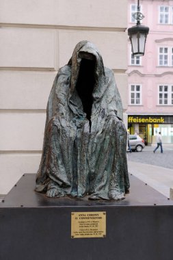PRAGUE, CZECH REPUBLIC - MARCH 6, 2022: The bronze Il Commendatore (Cloak of Conscience) statue by Anna Chromy on the Fruit Market Square, on March 6 in Prague