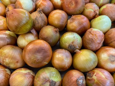 Tahta masada taze kırmızı soğan, üst görünüm, organik gıda kahverengi dilimler, hasır sepetin dışındaki sade ham kesim tahtası Ampul Gıda yerel çiftçi marketini içeriyor