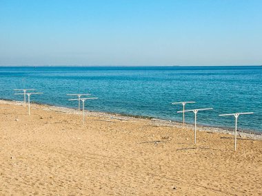 Fanari Ödülü Yunanistan 'ın kuzey kesiminde arka planda mavi gökyüzü ve çok ince kum bulunan plajda kazandı
