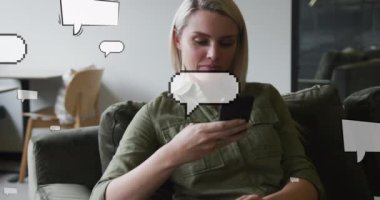 Animation of profile icons connecting with lines over beautiful caucasian woman talking on phone. Digital composite, multiple exposure, telecommunication, technology, lifestyle and home concept.