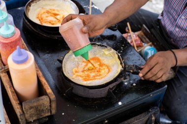 A person is pouring salad cream to Takoyaki pieces on a black stove