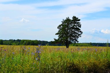 Bulutlu gökyüzünün altında bir yulaf tarlası, Sainte-Apolline, Quebec, Kanada