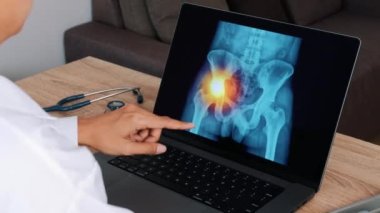 Woman doctor showing a x-ray of foot with pain in the toes on a laptop. Close up shot. High quality 4k footage