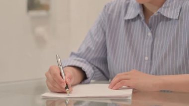 Masasında oturan beyaz bir kadın elinde kalemle günlüğe not alıyor, manzarayı kapatıyor. İş kadını yeni başlayan iş fikirleri ve planlar yazar. Not defterine yaratıcı düşünceler yazar. Yapılacaklar ya da istekler listesi oluştur