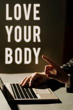 Kavramsal manşet "Vücudunu Sev, İş Fikrini Sev". Kişisel algılama Kendine iyi bak. Sağlıklı bir diyet yap.