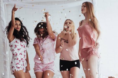 "Şu uçan şeylere bak. Konfeti havada. Genç kızlar güzel odadaki beyaz yatakta eğleniyor."