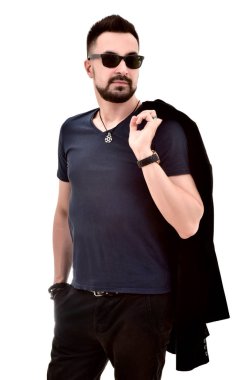 Gözlüklü bir rock şarkıcısı elinde bir mikrofonla beyaz arka planda.