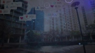 Animation of clock and social media icons over cityscape. Global social media, business, finances, computing and data processing concept digitally generated video.