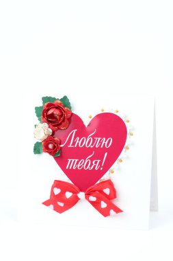 Red tassel Baba Marta symbol Martenitsa on white card on red background. International Martisor day celebrate spring arrival. Greetting card with text chestitia baba marta.