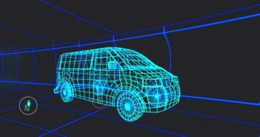 Animation of multiple digital icons over 3d van model moving in seamless pattern on black background. Automobile engineering and business technology concept