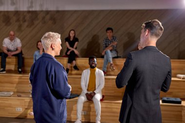 tattooed grey haired screenwriter holding scenario near african american woman with clipboard and actors in theater