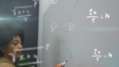 Animation of mathematical equations over african american female teacher holding blackboard. Global education, learning and digital interface concept digitally generated video.