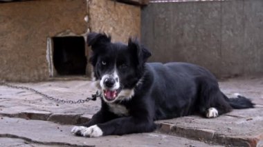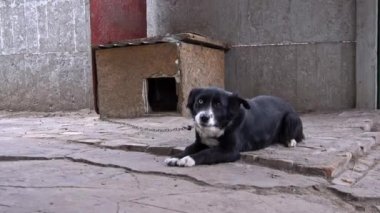 Sad dog sits on a chain tied near the booth. A watchdog guards people. Poor hungry and angry dog living in a booth.