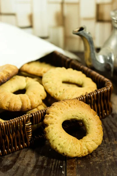 "Kaak of tlemcen in Arab" adı verilen geleneksel Cezayir bayramı kuru kurabiye halkası, Cezayir 'de sepeti ve çaydanlığı olan bir kasabadır.