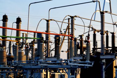 Part of high-voltage substation on blue sky background with switches and disconnectors. Ukrainian energy infrastructure.