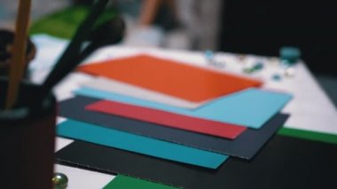 Kalemleri, kalemleri ve kâğıtları arka planda yavaş çekimde bej üzerine yerleştirin. Masa, iletişim, çalışma alanı, kırtasiye ve düzen kavramı.