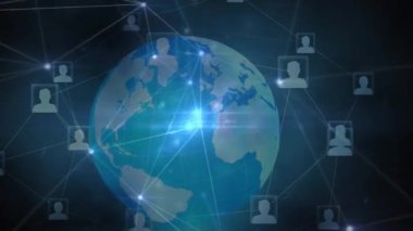 Dönen dünya üzerindeki profil simgelerinin ve çoklu tıklayan saatlerin animasyonu. Küresel ağ ve iş teknolojisi kavramı
