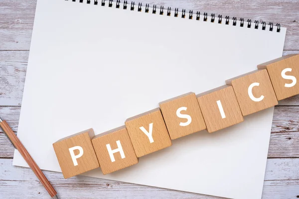 "PHYSICS" konsept metni, bir kalem ve bir defter içeren tahta bloklar.