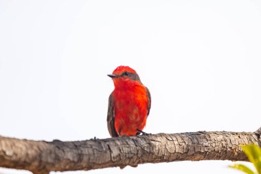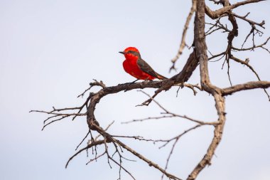"Prens" olarak bilinen küçük kırmızı kuş Pyrocephalus rubinus mavi gökyüzü ve dolunay arkaplanlı kuru ağaca tünemişti.