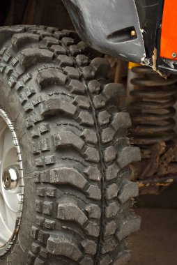Malang, Endonezya - 17 Eylül 2023: Tekerlek yüzeyinde büyük çıkıntılar olan off-road araç tekerleği