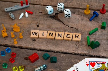 Scrabble harflerinin "Kazanmak" kelimesini heceleyen bir fotoğrafı.".