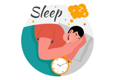Mutlu adam yatakta uzanıp huzur içinde uyuyor. Gülümseyen sakin genç adam yatak odasında şekerleme yapıyor. Rahatlama ve hayal kurma. Vektör illüstrasyonu.
