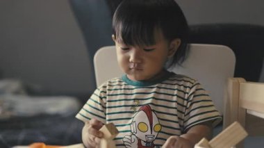 Küçük çocuk plastik hamuru ve inşaat setini oynayan şapka takıyor, yavaş çekim sahnesi.