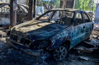 Shahed evleri havaya uçurdu. Saldırıdan sonra bombalanmış bir bina ve yanmış arabalar. Ukrayna 'da savaş, Dnipro şehri. Yanmış araba..