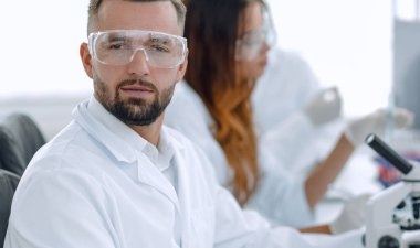 Beyaz önlüklü ve güvenlik gözlüklü yakışıklı Latin bilim adamı kameraya bakarak gülümsüyor. Genç Biyoloji Teknolojisi Araştırma Uzmanı. Ortalama Yakın Çekim Portresi