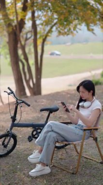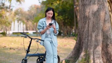 Asyalı kadın en sevdiği şarkıları seçmek ve dinlemek için cep telefonunu kullanıyor, parktaki bisikletçiliğe ara veriyor. Doğanın ortasındaki müziğin tadını çıkarıyorum. Yüksek kalite 4k görüntü