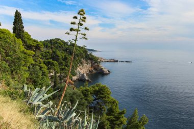 Liguria 'daki İtalyan Sahili' nde çiçekler. Arka planda mavi deniz olan pembe begonviller. Harika bir çiçek. Magenta bougainvillea çiçekleri.