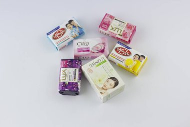 Jakarta, Endonezya. 28 Aralık 2023: Endonezya pazarında beyaz arka planda izole edilmiş çeşitli sabunlar