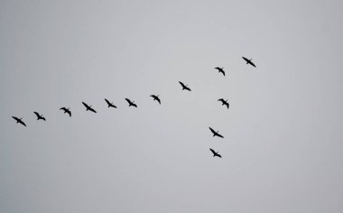 Turnalar havada V şeklinde uçar. Darss 'taki göçmen kuşlar. Siyah beyaz çekiliyor..