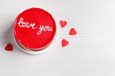 Mesajlı Bento pastası Love You ve pembe masada kağıt kalpler, mesaj için yer. Sevgililer Günü sürprizi