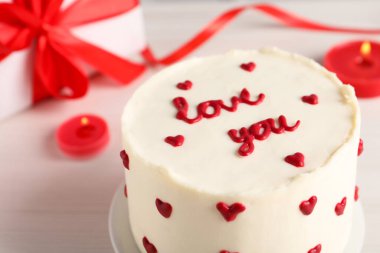 İçinde "Love You" yazan Bento pastası ve beyaz masada güller, yakın plan. Sevgililer Günü sürprizi