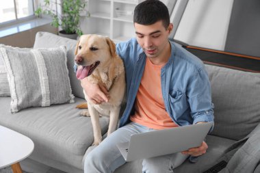 Miyastenia Gravis 'le savaşan bir adam, yanında sadık Labrador köpeği ile birlikte bir dizüstü bilgisayarla bir koltukta oturur..