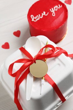"Seni seviyorum" yazılı Bento keki, mumlar ve hediye kutuları tahta masada, mesaj için yer var. Sevgililer Günü sürprizi