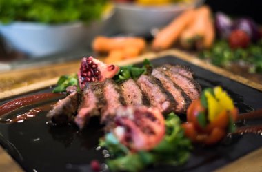 Izgara dana biftek sebze dekorasyonu ile. Izgara biftek.