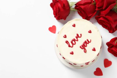İçinde "Seni seviyorum" yazılı Bento keki ve pembe masanın üstünde paket servis. Sevgililer Günü sürprizi