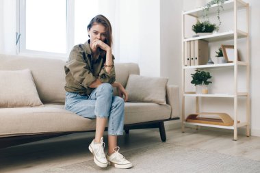 Üzgün ve Endişeli Kadın Bir Koltukta Otururken Evde Umutsuzluk ve Ruh Sağlığı Krizi İfade Ediyor
