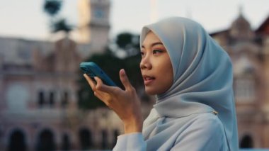 Hijab 'da genç bir kadın sokakta dikilirken Smartphone' da sohbet ediyor. Sokak Mesajlaşması 'nda Çekici Kadın, Açık Hava Telefon Kullanımı. Halk ve Telefon Konsepti