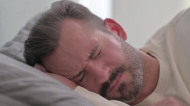 Sakallı ve gri saçlı orta yaşlı bir adam, gri bir yastığın üzerine uzanmış, rahat bir oturma odasında sarı bir yastık, beyaz bir gömlek giymiş, huzur içinde dinleniyor gibi görünüyor..